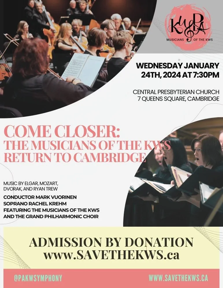 A concert featuring the music of Elgar, Mozart, Dvorak and Trew. Conducted by Mark Vuorinen and featuring Rachel Krehm, musicians of the KWS and the Grand Philharmonic Choir.
