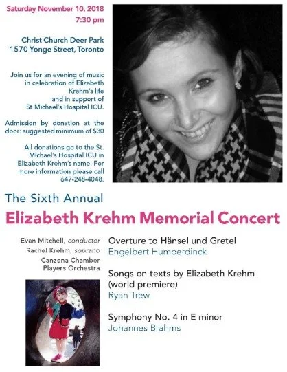 This year the concert features a special set of songs which have been written on Elizabeth Krehm’s texts by Canadian composer Ryan Trew. Her writing ranges from grade 2, to journals as a teenager. Her texts are evocative and are a window into her heart and mind. Ryan’s music reflects the intimate and personal nature of the poetry and prose